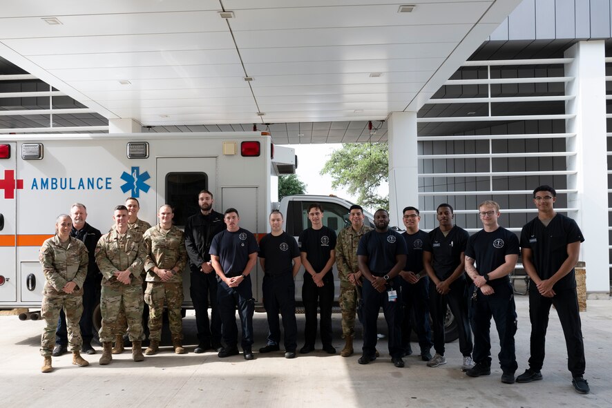 Staff from the 59th Medical Wing's Wilford Hall Emergency Department pose for a group photo following the recognition of two of their teammates at Wilford Hall Ambulatory Surgical Center, Joint Base San Antonio-Lackland, Texas, April 23, 2025. Two paramedics received the EMS Field Save Pin following their successful treatment of a patient experiencing cardiac arrest on Lackland Air Base Base in March 2025. A person's chance of surviving an out-of-hospital cardiac arrest event is approximately 9.1%. (U.S. Air Force photo by Tech. Sgt. Tory Patterson)